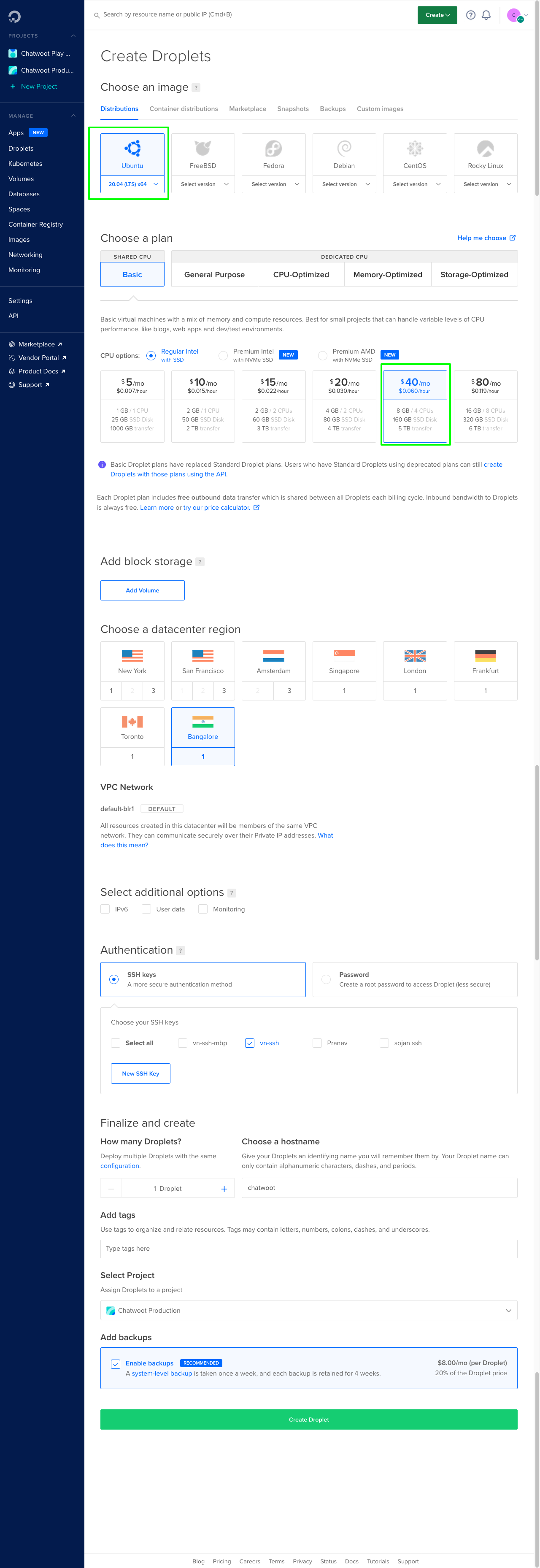 - Under authentication, choose your SSH key or create a new one. This is important as you will need this key to complete the next section.